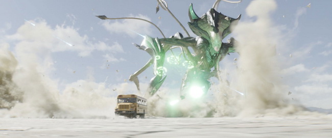 “La séquence se déroule dans et autour de la Zone 51. Nous avons filmé les plans sur un désert salé, notamment tous ceux avec l’autobus que l’alien essaie de rattraper. Le problème était que la voiture caméra laissait des traces de pneus sur le sol. Il était prévu que Weta les efface de l’image, mais ils se sont rendus compte qu’il était plus productif de tout remplacer par un environnement et un bus créés par ordinateur. Dans la plupart des plans, toute l’image est une création numérique, dans d’autres, seul le bus est réel. Ils ont réussi à produire un shader qui reproduisait exactement le look du sol original.”