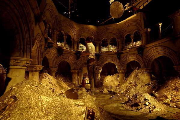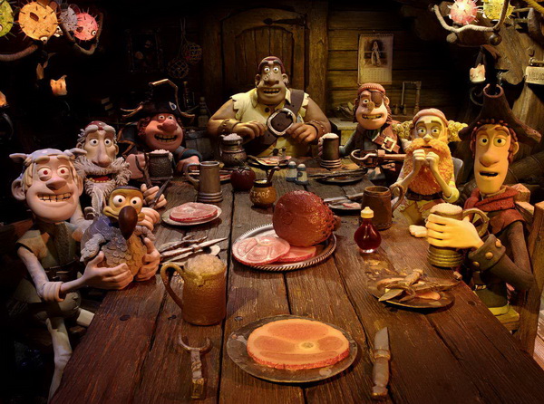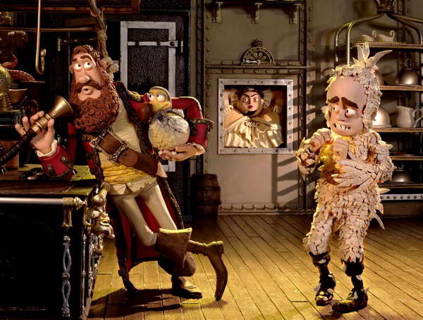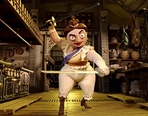 Les décors ne sont pas en reste. Le bateau pirate a été entièrement fabriqué à la main et se compose de 44 569 pièces. Sa conception a nécessité 5 000 heures de travail pour un poids final de 350 kilos. Et le vaisseau amiral de la reine Victoria, un croiseur métallique, comprend 30 000 lentilles collées sur la coque pour figurer les rivets. La salle du trésor de la Reine Victoria contient plus de 400 000 pièces d’or. Et l’équipe d’accessoiristes d’Aardman a également créé plus de 220 000 accessoires d’arrière-plan ou de premier plan pour remplir les décors du film.
