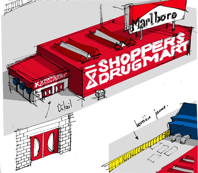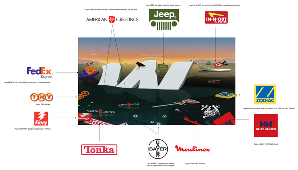 "Mettre plein de logos ce n'est pas simple visuellement. Cela implique des choix graphiques", ajoute Hervé de Crécy. "Il fallait que l'esprit reste 2D. Donc, l'objectif était de créer de la 3D avec un rendu 2D. C'est plus compliqué que la 3D classique avec un logiciel qui calcule tout seul où placer les ombres et tout... Là chaque plan est dessiné."