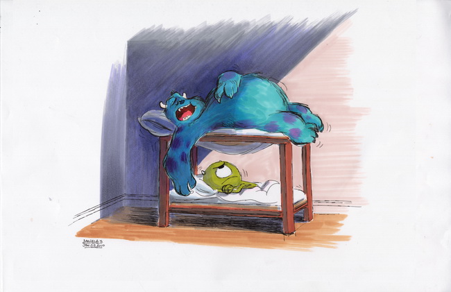 Jason Deamer : L’animateur de Sulli, par exemple, commençait à animer son personnage, puis lorsqu'il avait terminé, il passait le plan à l'animateur de Bob qui animait sa partie de la scène. Le plan faisait ainsi plusieurs allers retours jusqu'à ce que tout soit parfait. Il est certain que ce procédé nécessite beaucoup plus de temps qu'une organisation classique. En animation « parallèle », plusieurs animateurs s'occupent du même personnage en même temps.