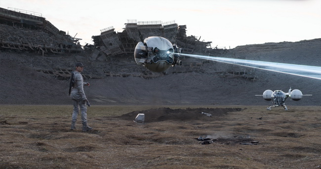 Cette Tour est la base d’attache du Techoptère, sorte d’hélicoptère futuriste avec lequel le héros, Jack, explore la planète. Suivant les scènes, l’engin a été créé par Digital Domain ou Pixomondo – les deux sociétés ont étroitement collaboré sur ce film. “Nous sommes partis du vaisseau réel qui avait été construit grandeur nature par la production,” explique R. Matt Smith. “Il était remarquablement détaillé. L'équipe des effets spéciaux de plateau l'avait installé une plate-forme mobile qui permettait de simuler les mouvements de vol sur les acteurs à l'intérieur. Cela permettait de filmer tous les gros plans sur le cockpit. Dans ces cas-là, on filmait sans la bulle de verre car elle reflétait le studio et le fond vert. Dans les plans larges, l'engin est une animation 3D. Le vaisseau réel a été photographié sous tous les angles et sous différentes configurations d'éclairage. Nous avons pu ensuite reconstituer l’engin avec une extrême précision. Cela dit, la plupart des scènes de vol ont été réalisées par Pixomondo.”