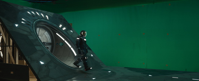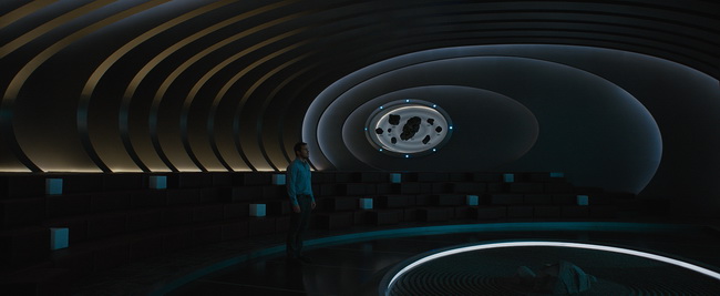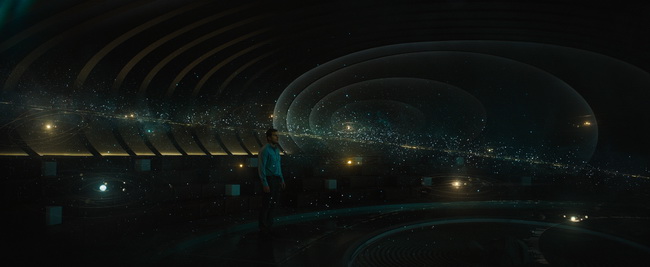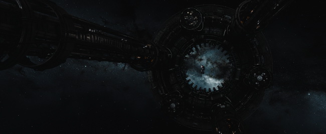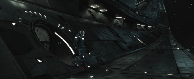 Les plans du vaisseau dans l’espace reposent sur une charte graphique originale. Excepté une séquence particulière, il n’y a aucune planète, ni aucun soleil pour illuminer le vaisseau. Il est éclairé uniquement par les étoiles de la Voie Lactée. “Nous voulions nous éloigner du look traditionnel des scènes dans l’espace au cinéma, avec une lumière directionnelle puissante et des ombres très marquées façon NASA. Par conséquent, la lumière sur le vaisseau est très douce, les ombres sont très peu marquées. La lumière provenait d’un énorme dôme virtuel sur lequel étaient projetées des centaines de milliers d’étoiles représentant la Voie Lactée. Elles ont été réalisées en HDR à partir de dizaines de maps superposés qui constituaient une image à la résolution tout à fait extraordinaire ! Certaines nébuleuses étaient projetées sur des cartes devant le dôme afin d’avoir plus de profondeur dans l’image et de générer un effet de parallaxe. En plaçant le modèle du vaisseau au centre de ce dôme, les surfaces se retrouvaient éclairées naturellement par la lueur des étoiles. Par contre, les temps d’exposition étaient extrêmement longs… ”