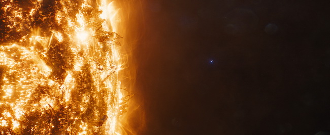 L’environnement spatial change du tout au tout lorsque le vaisseau se dirige droit vers une étoile. L’occasion pour MPC de montrer un soleil de très près – une vision rarissime au cinéma. “Le soleil a été créé couche par couche d’après la structure qui compose les vraies étoiles. Il y a eu plusieurs simulations principales réalisées dans Houdini et Flowline. Elles se sont superposées pour créer un effet de profondeur. Cela dit, c’est la seule séquence pour laquelle nous avons triché avec la réalité. Dans le monde réel, le vaisseau ne pourrait pas être aussi près de l’étoile, il aurait été carbonisé bien avant, mais le spectacle de ce monde rougeoyant était trop beau pour ne pas s’en approcher. Ce qu’il y a d’intéressant par ailleurs, c’est que nous avons projeté la prévisualisation du soleil dans le décor avec les acteurs. Les plans intérieurs ont été filmés devant un écran de contrôle géant qui était en réalité un mur de LED très puissantes. Lorsqu’on diffusait les images du soleil, elles éclairaient le décor tout entier et les acteurs ! Ça ajoute énormément au réalisme de la scène !”