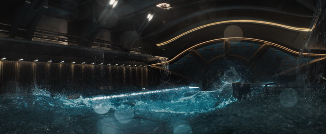 Une fois les simulations en place, restait encore à accomplir le plus délicat : intégrer l’actrice Jennifer Lawrence de façon convaincante dans cette énorme masse liquide en suspension… Les plans ont été tournés dans une piscine entourée d’un décor partiel, MPC a ensuite ajouté le reste du décor par ordinateur. La première partie de la scène a été filmée avec la piscine pleine, la seconde avec le bassin vide.