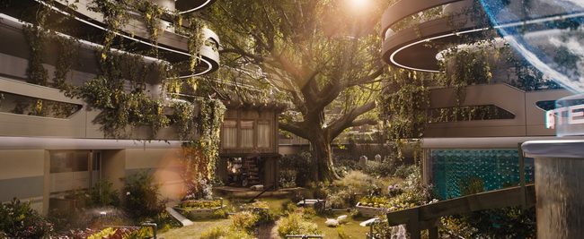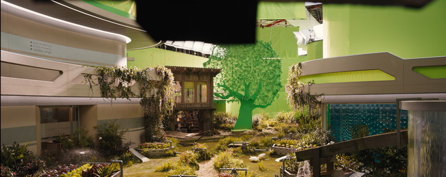Le projet comprenait deux grandes catégories d’effets : l’intérieur du vaisseau et l’extérieur. Pour le premier, MPC a réalisé d’importantes extensions de décor au niveau de la baie d’hibernation, de la cafeteria, de la salle des machines et du grand hall central. Pour le second, il a fallu mettre au point un vaisseau comme jamais encore le cinéma nous en avait montré. “Nous avons décidé de le modéliser en une seule version,” précise Nordby. “Nous ne voulions pas d’un modèle pour les plans larges, un autre pour les plans serrés, un autre pour les gros plans, etc. C’était trop compliqué à gérer. Un seul modèle devait pouvoir répondre à tous les besoins, ce qui impliquait une conception incroyablement robuste. Les surfaces devaient être en mesure de supporter n’importe quel type de plan. En même temps, il était impossible de tout modéliser et texturer à très haute résolution, le modèle aurait été ingérable. Notre approche a donc consisté à procéder scène par scène. Dès que nous savions précisément ce que la caméra allait montrer, nous ajoutions des panneaux, des antennes, des structures mécaniques, des irrégularités sur les surfaces, etc., tout ce qui pouvait briser les lignes et créer une impression de densité. À l’arrivée, il y a donc des sections du vaisseau qui sont beaucoup moins détaillées que d’autres.”