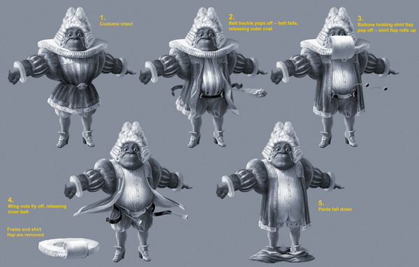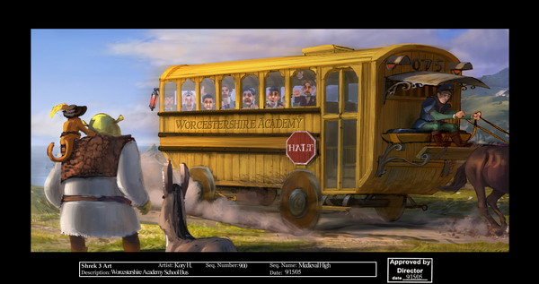 Guillaume Aretos : Oui, presque 4 ans! J'ai même commencé sur Shrek 3 alors que Shrek 2 n'était pas encore fini. En tant que Production Designer, j'étais responsable général de l'image du film et supervisais les directeurs artistiques. J'ai commencé par un an et demi de préproduction, à travailler en petite équipe (environ 15 personnes) avec le réalisateur, le producteur, les D.A. et quelques artistes (l'Art Department). Il s'agissait de designer les personnages et les décors, ainsi que l'ambiance des scènes. Ensuite, la phase de production a duré 2 ans avec 350 à 400 personnes au travail. Là, j'ai continué à faire du design pour environ 20% de mon temps et supervisé les autres départements pour le reste. Cela veut dire regarder chaque jour les « dailies » (cad les images produites) par le modeling, les Character TDs, le surfacing, le layout (position des caméras). Je joue aussi le rôle de directeur de la photo pour le lighting, pour déterminer la lumière et les réflexions sur les surfaces. Je travaille beaucoup avec le Superviseur Fx, en l'occurrence Philippe Gluckman, pour tout ce qui est simulations. Enfin, la phase finale de mon job consiste à étalonner le film avant sa « release ».