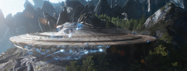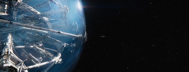 Pour les plans de l’USS Enterprise dans l’espace, Chiang a cherché à donner aux images un côté plus tridimensionnel (au-delà du simple relief 3D). L’équipe s’est ainsi largement inspirée du look des vrais engins spatiaux de la NASA, la manière dont le soleil les éclaire, la quantité de lumière qui se reflète de la planète, etc. Pour « casser » le look trop propre du numérique, de nombreuses saletés et défauts ont été ajoutés dans l’image. De même, le rendu des blancs a été saturé pour être surexposé, comme c’est le cas dans les images de la NASA. Double Negative est même allé jusqu’à simuler un cheveu dans un coin du cadre ! L’idée était de retrouver un style plus naturaliste et moins clinique de façon à renforcer le réalisme des scènes spatiales.