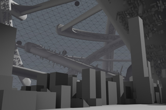 L’équipe a commencé par dresser le plan urbain de chaque bras de la station spatiale Yorktown, avec la position des artères, des bâtiments principaux, et des plans d’eau. Ces plans ont ensuite été implémentés dans CityEngine à partir de la banque de géométries : pas moins de 800 éléments individuels ont été créés pour peupler le modèle, depuis les plus grosses superstructures jusqu’aux plus petits réverbères et buissons. Une fois les bâtiments en place, le programme a ajouté l’habillage urbain et la végétation, toujours en piochant dans la banque de données. À l’arrivée, Yorktown est composé de 1,3 milliards de polygones ! Tout simplement le plus gros projet de modélisation de l’histoire du studio…