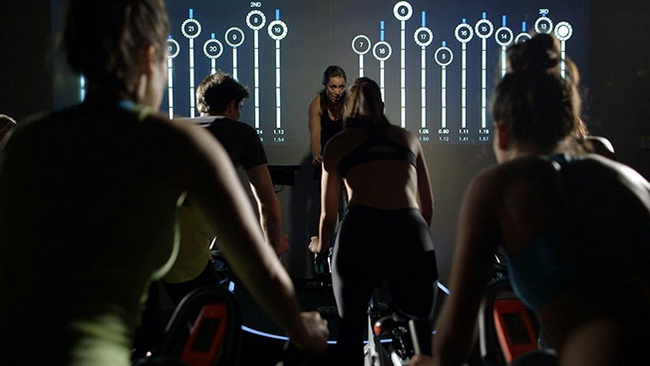 Salle de Fitness 2.0: deux équipes font une course poursuite avec exercices et résultats en direct sur le mur du fond