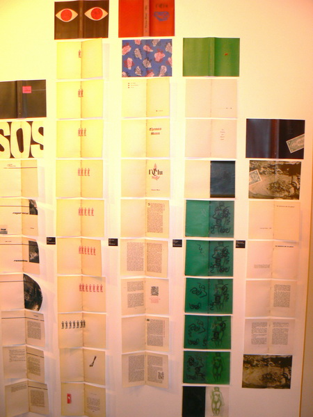 Exposition à la galerie Anatome du club du meilleur livre: reproductions des couvertures et pages de garde des livres sont affichées verticalement sur les murs pour une vision panoramique de leurs créations graphiques.