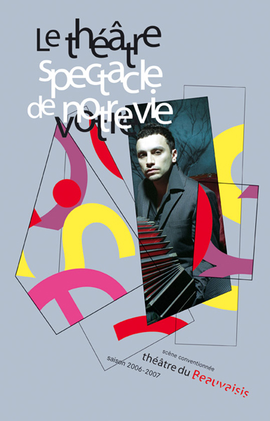 "Pour la saison 2006-2007 les écritures typographiques beauvaisis et oise en 4 couleurs qui véhiculent l'image de marque du théâtre depuis 2004 sont capturées dans des formes trapézoïdales. Un accroche vient accompagner les différents supports : ici Le théâtre, spectacle de notre (votre) vie, Vivre le spectacle pour la page d'ouverture du site internet, Rêver V(n)otre vie pour les dépliants et les affiches de saison."