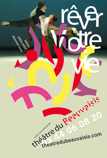 "Les écritures typographiques beauvaisis et oise en 4 couleurs capturées dans des formes trapézoïdales au début de la saison se libèrent et dans un mouvement d'envol donnent naissance à l'expression Rêver V(n)otre vie comme théâtre, lieu de concrétisation de tous nos rêves."