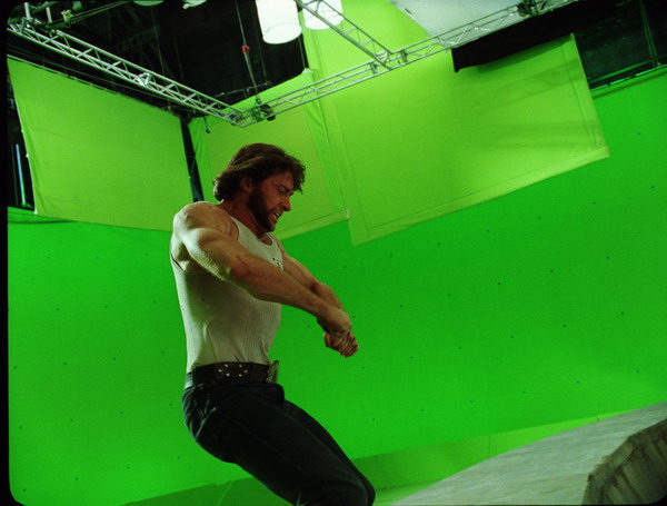 Hugh Jackman tourne en studio sur fond vert.