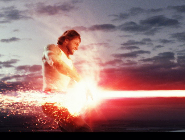 Suite de la scène, image finale composite avec matte painting pour le ciel, griffes de Wolverine et rayons laser rajoutés par le studio Hydraulx.