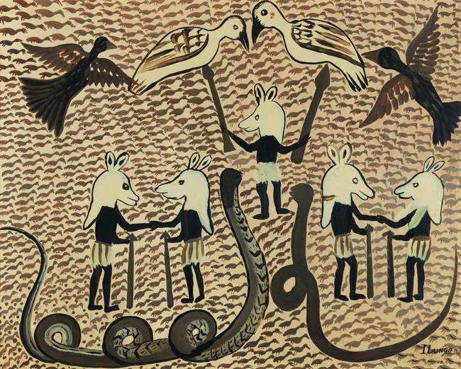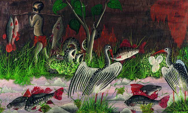 On commence le parcours avec la dernière génération, celle des Jean-Paul Mika et Monsengo Shula, apparue au début des années 2000, et qui veut inscrire le Congo dans la modernité du monde dans la lignée de Chéri Samba et de la génération révélée par les années 70-80. Et puis on remonte le temps : les années 50-60, creuset d’un art congolais moderne avec l’académie des Beaux-Arts de Kinshasa. Avec enfin les précurseurs, des années 20 à l’après-guerre, artistes traditionnels initiés à la peinture sur toile par quelques Européens éclairés. Les thèmes évoluent aussi : liés d’abord à la nature, à la vie quotidienne, aux fables locales et aux rêves, ils abordent dès les années 60-70 les réalités politiques et sociales de leur temps. Mais ces « artistes populaires » comme ils se nomment eux-mêmes restent en même temps fidèles à une peinture figurative, explicite et séduisante.