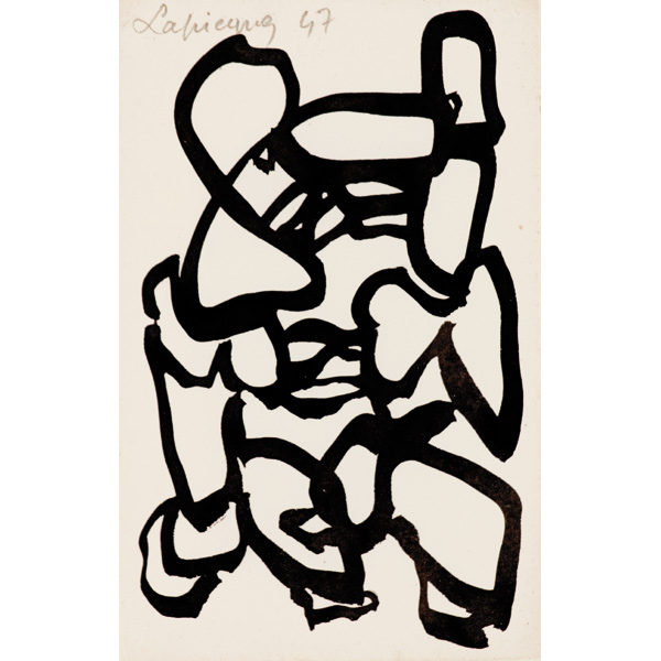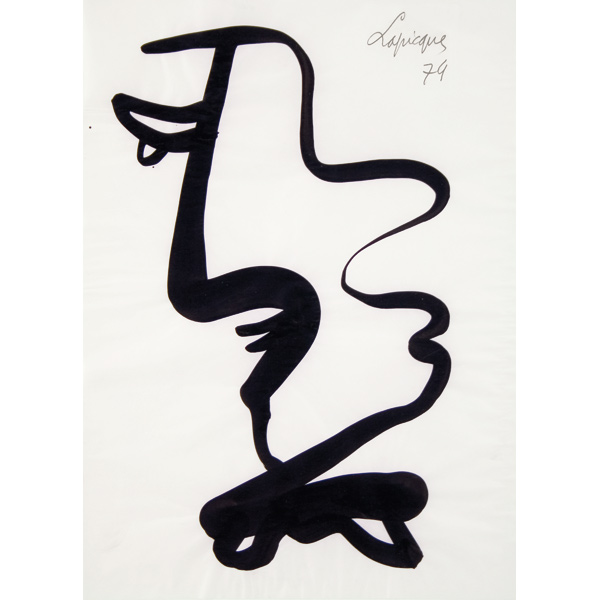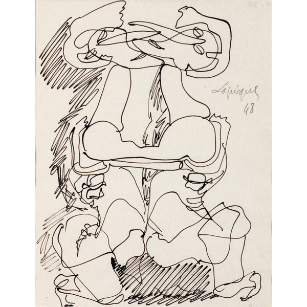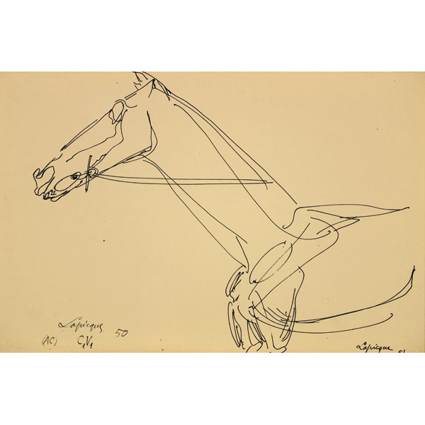 Bien que Charles Lapicque se soit d’abord consacré à la peinture non-figurative, parce qu’issu de la nouvelle école de Paris, il s’est aussi tourné vers le dessin de manière méthodique, dans un style qui résonne avec celui de Dubuffet, tout comme celui de Pierre Soulages. Contemporain de Picasso, cet artiste à l’œuvre picturale polymorphe, qui fut ingénieur spécialisé dans la distribution d’énergie électrique jusqu’en 1928, surprend par sa spontanéité et une stylistique étonnante. Ce sont les souvenirs du Lapicque jeune soldat, mobilisé dés 1917, qui habitent en premier lieu les dessins de l’artiste. A l’instar d’un Géricault fasciné par les chevaux et les mouvements qu’ils dessinent, Charles Lapicque donne ainsi naissance aux silhouettes élégantes, tantôt parfaitement totémiques, tantôt inspirée des musculatures équestres, que le visiteur peut désormais rencontrer à la Collection François Desnoyer. Dans ses dessins, le trait, la ligne et le geste se font mouvements libres, laissant transparaître les influences antérieures de peintres cubistes, comme ceux du fauvisme. Une douzaine de dessins sont donc rassemblés dans cette exposition, qui tient autant d’une découverte coup de cœur que d’un « commando » selon les propres mots de Sébastien Planas qui a souhaité laisser toute leur liberté aux œuvres de Lapicque, les accompagnant d’un contenu textuel limité parce que « ses œuvres parlent d’elles-mêmes et apparaissent comme les vestiges d’une sélection draconienne de l’artiste ». En effet, souvent déchirés lorsque Lapicque les décrétait mauvais, ces dessins se font rares dans les collections privées comme publiques, ce qui donne à cette exposition une valeur toute particulière.