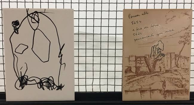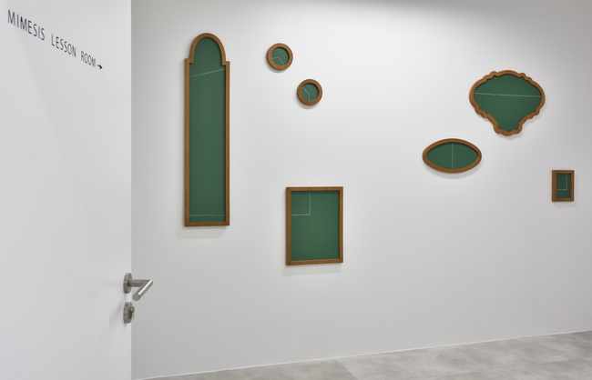 Les installations annexes jouent elles aussi sur l’ambigüité. Mimesis lesson, composée de plusieurs fragments d’ardoise encadrés comme des miroirs, réunit ces supports à travers une silhouette unique de craie dessinée, suggérant ainsi des fenêtres ouvertes sur une autre réalité. Debora Bolsoni, diplômée d’un Master en Poétique Visuelle de l’université de Sao Paolo, s‘y entend à nous renvoyer notre regard, à re-conditionner notre manière de voir.