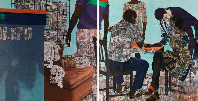 On ne peut qu’approuver le choix du jury, tant l’œuvre s’impose par sa richesse visuelle et sa subtilité. Njideka Akunyili Crosby compose des scènes d’intérieur intime, où l’on peut reconnaître l’artiste elle-même ou son mari dans un environnement mêlant modernisme occidental et références africaines. Elle combine pour ce faire le dessin, la peinture et le collage de photocopies de photographies diluées à l’acétone et réunies comme les motifs d’un tissu.