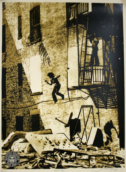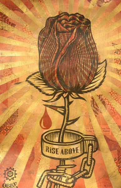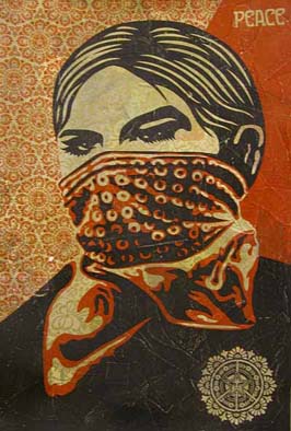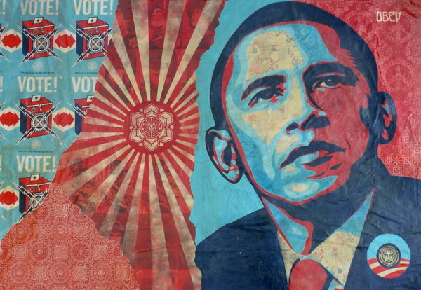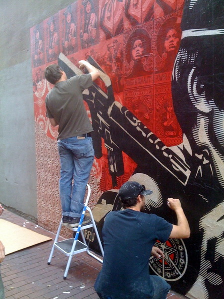 Contrairement aux graffiti, les affiches et stickers Obey de Shepard Fairey multiplient les références historiques et culturelles dans leur iconographie : constructivisme soviétique, imagerie révolutionnaire ou islamique y sont recyclés. A travers un patient travail de collecte il prépare une base de collage très élaborée et déjà pleine de référence et de sens. Par la suite, l'artiste utilise les pochoirs et la peinture pour revenir sur les grands collages. La sérigraphie est sa technique de production privilégiée, susciter l’interrogation son credo.
