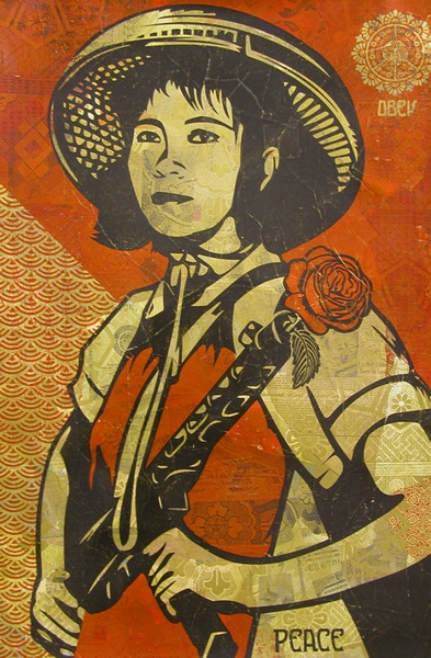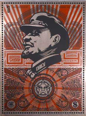 Au milieu des années 90, Shepard Fairey choisit le slogan Obey (« Obéis ! ») comme signature et marque de fabrique après avoir vu le film de science fiction politique They live (Invasion de Los Angeles en français) de John Carpenter, film où le héros découvre grâce à des lunettes spéciales que le monde apparent n’est qu’une mise en condition, un asservissement des humains par une minorité d’extraterrestres qui dirige la Terre. Shepard Fairey continue sa carrière depuis lors en alternant un travail de graphiste et illustrateur (pochettes de CDs, etc) et street art engagé (avec des affiches anti-Bush en 2004 par exemple).
