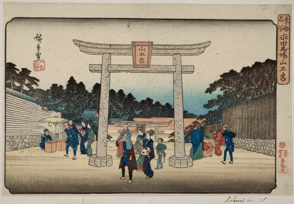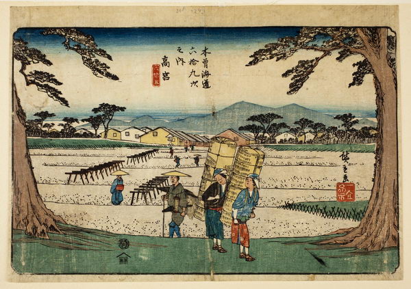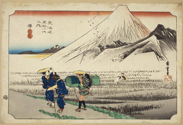 Hiroshige (1797-1858) est un maître de l’estampe japonaise, non pas de courtisanes (le sujet n’est plus à la mode à son époque) mais de paysages et de scènes de voyage. S’inspirant de livre et guide de voyage plutôt que de la réalité, il bâtit sa réputation dans les années 1830 et 1840 en réalisant des estampes illustrant les étapes de voyage entre Kyoto et Edo (ancien nom de Tokyo) suivant deux itinéraires, le Tokaido le long de la côte Est et le Kisokaido à l’intérieur des terres. Ces estampes, publiées et vendues comme souvenirs aux voyageurs, intègrent dans leurs paysages la perspective à l’occidentale mais se distinguent par la variété des cadrages et la richesse des détails, propices à l’immersion du spectateur attentif dans la scène.