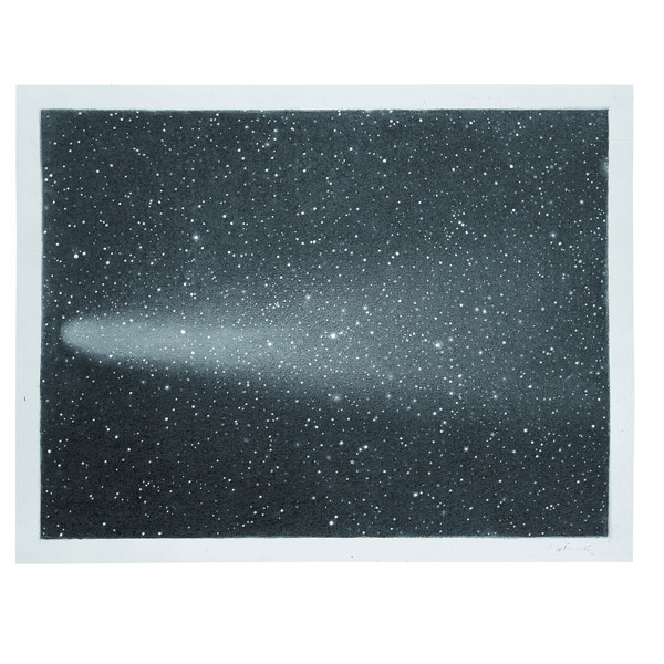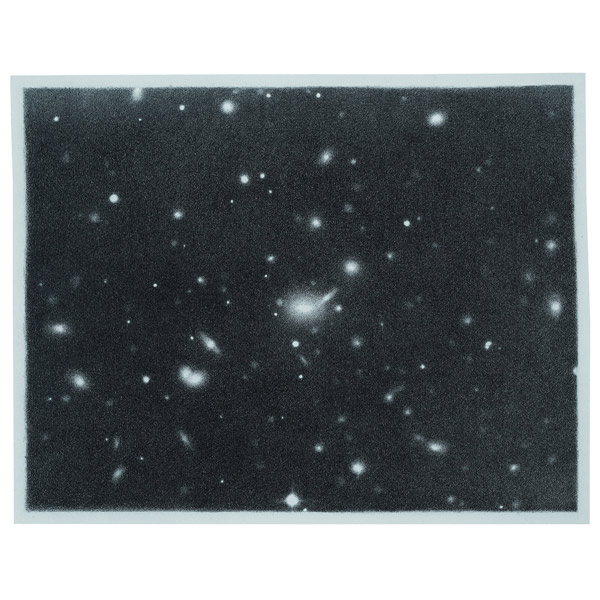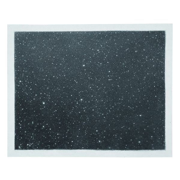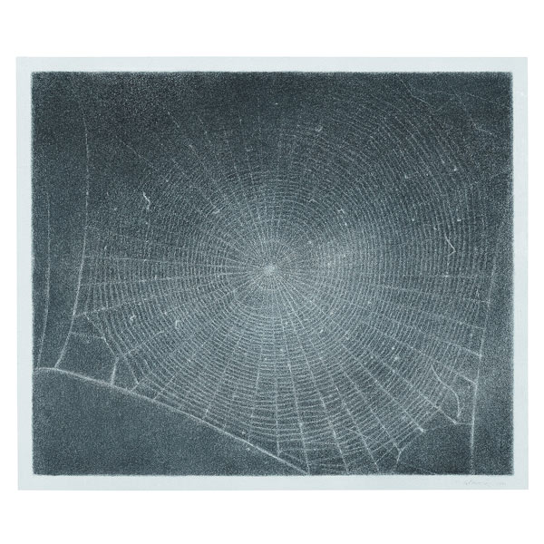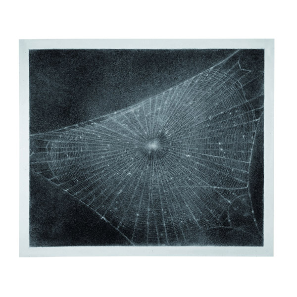 L’artiste poursuit sa mélodie teintée d’une douce tristesse, en noir et blanc, accumulant avec dextérité les séries d’océans et de déserts (principalement celui de Death Valley, en Californie) où la plus petite des pierres a, elle aussi, droit à son heure de gloire. Elle se tourne ensuite à la fin de son œuvre, vers des compositions de galaxies transformant les étoiles en de fragiles taches blanches, petites giclées d’univers sur l’infini fusain tout puissant. Viennent enfin des espaces moins démesurés : les toiles d’araignée (Web # 4, 1998 et Web # 9, 2006) qui rappellent le travail attentif de Giusepe Penone, lorsque celui-ci se penche avec respect sur les nervures d’une feuille. Romantisme et mélancolie se conjuguent cette fois d’une manière plus posée, laissant transparaître comme un assagissement dans l’œuvre de cette artiste qui n’a été jusque là présentée aux regards des français qu’en 1995, à la Fondation Cartier. Entre profondeur et hypnotisme, l’œuvre de Vija Celmins se regarde de la même manière que l’on marche sur la mousse verte d’une forêt, en la ressentant et la respirant.