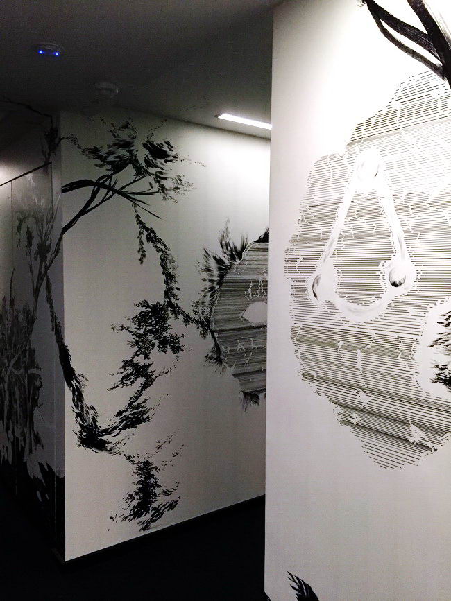 Drawing Lab, au sous-sol de Drawing Hotel, se veut lieu d’expérimentation et de production. Il a pour ambition de donner l’opportunité aux artistes contemporains de faire sortir le dessin de la feuille et d’en explorer toutes les facettes. Premièr invité, Keita Mori investit avec Strings, l’ensemble de l’espace du Drawing Lab jusqu’au 20 mai 2017. L’artiste japonais, qui vit à Paris, y développe un projet ambitieux sur la migration, le transit, le passage entre deux états d’âme et deux états frontaliers, avec la technique singulière qu’il a développée (d’immenses dessins muraux composés de fils textiles). Un univers de fils noirs, tel une représentation filaire mais en 2D plutôt qu’en 3D et qui « évacue les ombres et la polychromie, ne gardant que le squelette fragile et temporaire des figures qui les composent » comme le résume poétiquement le commissaire d’exposition Gaël Charbau.