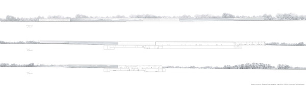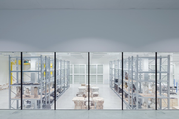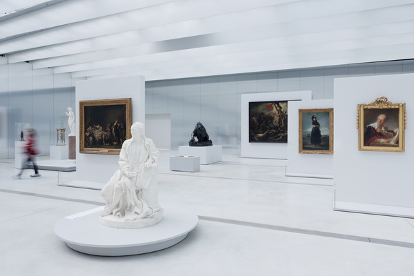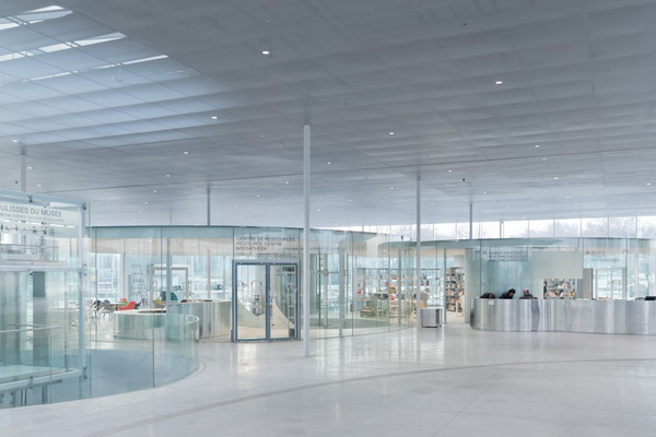 D’une surface de 28 000 m², l’ensemble s’étend sur 360 mètres de long de part et d’autre d’un foyer central aux murs de verre transparent. Ce volume d’entrée (68,5m x 58,5m, 6m de haut) est conçu comme un vide faisant partie du paysage et visible de partout. Les bâtiments situés à l’Est du hall d’entrée - la Grande galerie et le Pavillon de verre - abritent principalement les collections du Louvre. A l’Ouest du hall d’accueil se trouvent la Galerie d’exposition temporaire et La Scène, un vaste auditorium « nouvelle génération » dont la programmation est en lien direct avec les expositions. Les volumes d’exposition sont enveloppés dans une façade d’aluminium anodisé poli, renvoyant une image estompée, floutée, des contours du site. De fines colonnes d’acier, de couleur blanche, soutiennent la toiture métallique.