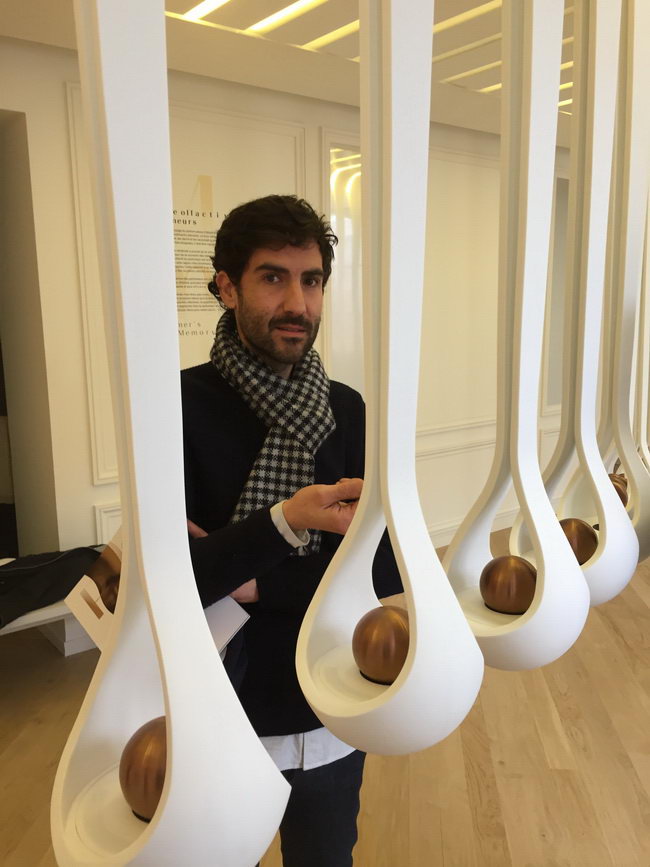 Les odeurs ne se voient pas, elles se diffusent. Projectiles, agence dirigée par les architectes Reza Azard et Daniel Meszaros et le designer Hervé Bouttet, est partie à la recherche de talents du design et de l’artisanat pour créer des dispositifs scénographiques uniques. Le « Jardin des Senteurs » engage à la promenade olfactive parmi les odeurs du quotidien : un bouquet de compositions évocatrices créées par des parfumeurs et diffusées par des corolles. La collection de matières premières est signée du studio anglais Harvey & John : une série de fioles métalliques en forme de goutte et disposées sur des présentoirs suspendus depuis le plafond proposent 25 odeurs .