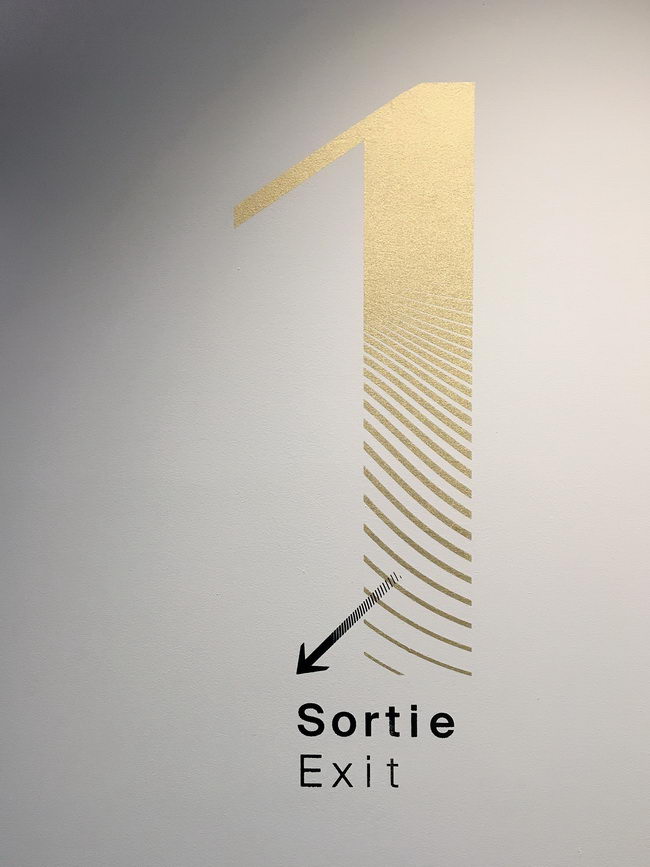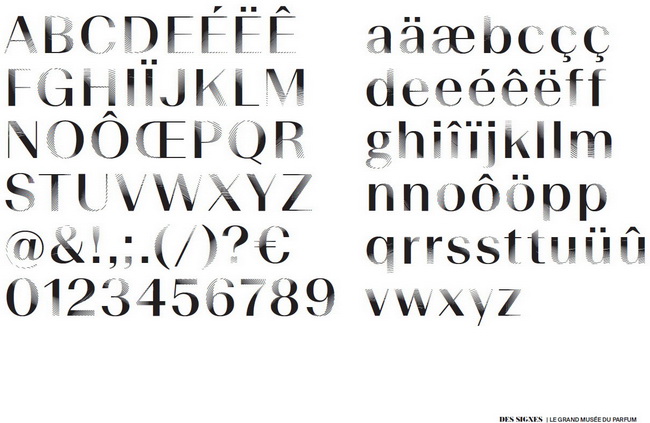Le studio Des Signes de Franklin Desclouds et Elise Muchir a été sélectionné en juin 2016 pour concevoir la signalétique du Grand Musée du Parfum, puis sa charte graphique et même la campagne d’affiches du lancement en janvier 2017. Pour mettre en accord univers visuel et olfactif du musée, Des Signes a développé des traitements typographiques spécifiques. Les inscriptions se déploient à même les murs en lettres d’or, les textes descriptifs en noir. Les caractères de l’alphabet Beausite, choisi pour ses pleins et ses déliés propices au titrage, ont été enrichis de trames ondulantes pour faire « s’évaporer » en partie la lettre tout en lui gardant une partie solide pour l’ancrer sur le support : un principe de flottaison qui référence l’effluve du parfum. Ces trames ont d’abord été dessinées dans Illustrator puis converties en une police utilisable sur ordinateur dans le logiciel Robofont. Les textes sont eux composés en caractères Suisse, mais en variant progressivement les approches entre les lettres pour créer un « sillage typographique », le côté du paragraphe le plus dense indiquant au visiteur la direction à suivre.