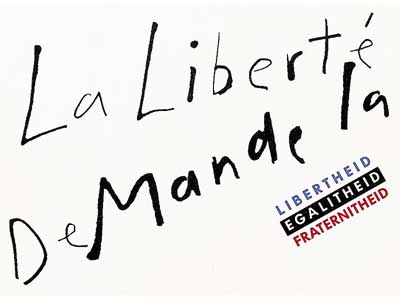 Alain, maître de l'école du graphisme engagé s'entend, qui détourne le portrait officiel d'un président en exercice et par l'ajout de trois inoffensifs triangles l'affuble d'un bonnet d'âne minimaliste - voire suprématiste - et mine l'allure martial qui pointe encore sous ce couvre-chef tricolore et iconoclaste. Alain, l'amateur de jeux de mot, aime par dessus tout l'économie de moyens.