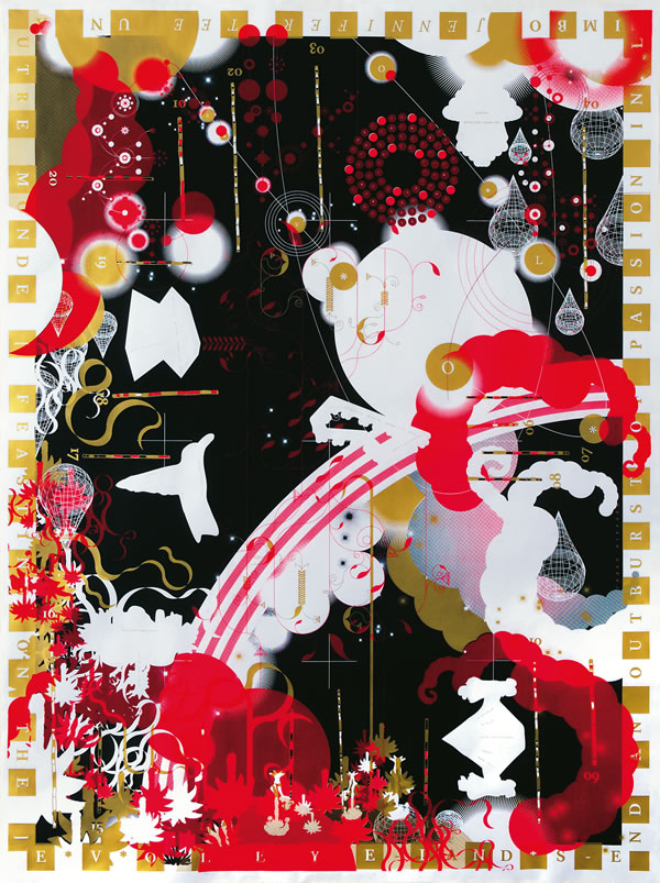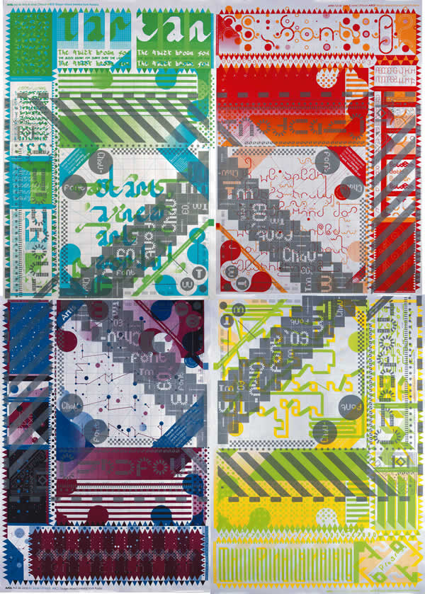 C'est à la Chapelle des Jésuites qu'est exposé le travail du jeune graphiste néerlandais Richard Niessen. On se souvient d'avoir (re) découvert dans cette même chapelle, les années précédentes les "ornements baroques" des M/M (Paris) et les expérimentations typographique de Pierre di Sciullo. La belle chapelle s'affirme donc comme LE lieu où s'affichent toutes les audaces graphiques. Et Richard Niessen, 35 ans, ne déroge pas à la règle. Diplômé de la Gerrit Rietveld Academie d'Amsterdam dans laquelle il enseigne depuis 2002, il travaille comme graphiste freelance et fréquente assidument son compatriote Harmen Liemburg avec lequel il a travaillé sous le nom de Goldenmasters. L'exposition TM-City s'appuie sur le concept TM (pour Typographic Masonry) qui structure son travail. Un concept développé à l'issue de la visite d'une exposition consacrée à l'architecte batave Henricus Theodorus Wijdeveld, plus célèbre pour ses théories philosophiques et culturelles que pour ses - rares -constructions. Traduit graphiquement par Richard Niessen, ce concept très "constructiviste" de Typographic Masonry réside en des motifs géométriques constituant les éléments de base d'élaborations graphiques stratifiées, ludiques et colorées. On parle ici d'abstraction, plus du tout de narration.