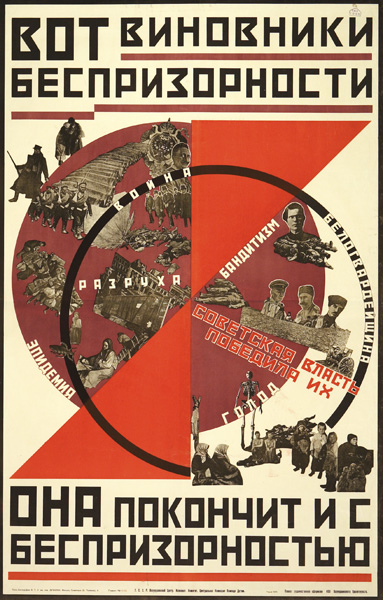 Leur nombre, la diversité de leur sujet et surtout leur qualité plastique témoignent du rôle de l’affiche dans les premières années du régime soviétique. Signées par les élèves de Malévitch comme Rotchenko, par El Lissitzky, Klucis ou encore les frères Stenberg, elles sont la continuation directe des avant-gardes de la peinture. Leurs auteurs ont su inventer des principes durables dans la construction typographique, l’emploi de la photographie et du montage.