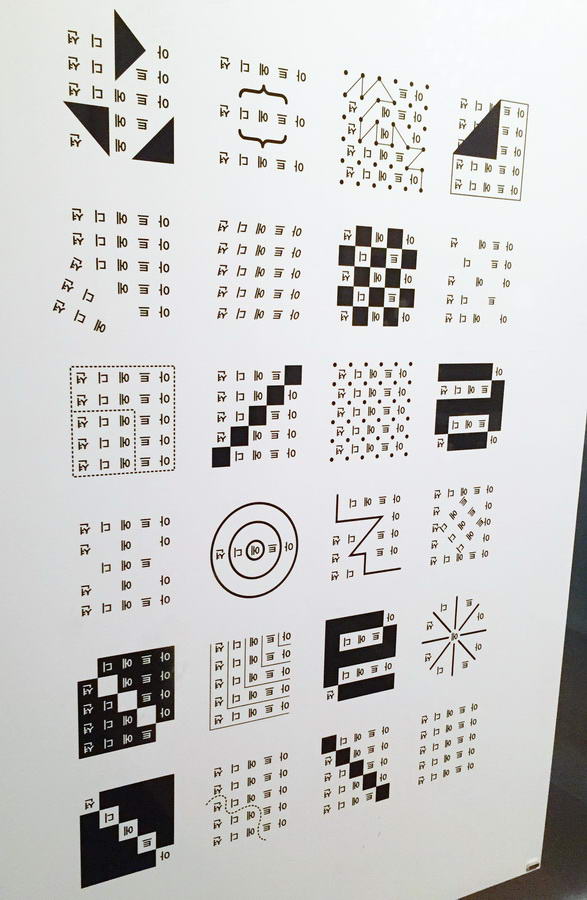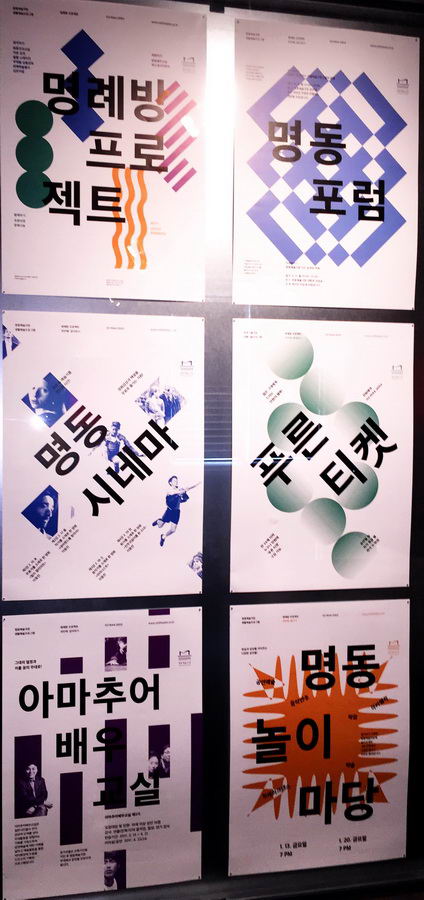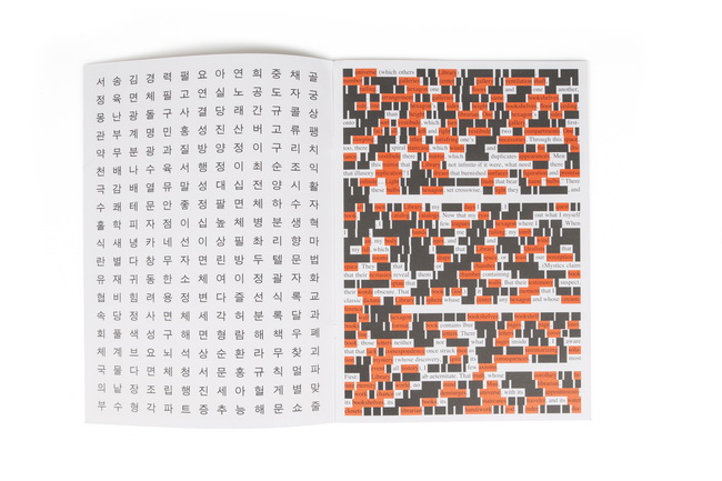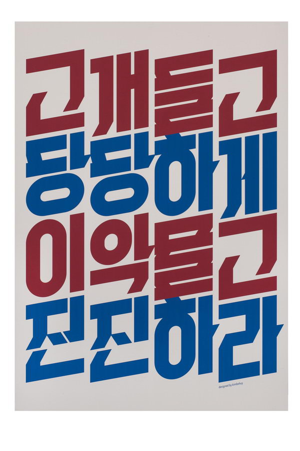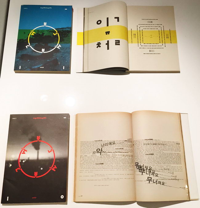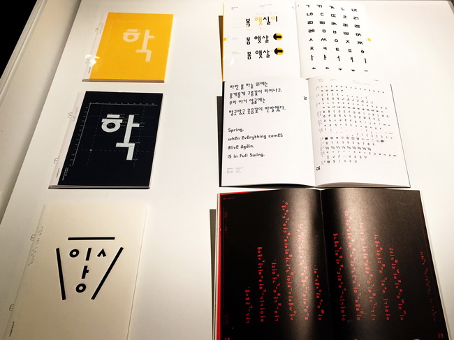 « L’une des spécificités du design graphique coréen, explique la commissaire Amélie Gastaut, est l’intérêt commun de ses acteurs pour la typographie et plus particulièrement pour leur alphabet, le hangul. » Si la création du hangul remonte à l’année 1443, son emploi ne se généralise véritablement qu’à la fin de la Seconde Guerre mondiale. Les vingt-sept lettres (vingt-quatre aujourd’hui) de cet alphabet, qui remplacent les 40 000 idéogrammes chinois, ont été fondées sur des principes philosophiques (confucianisme, yin et yang).