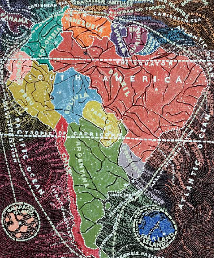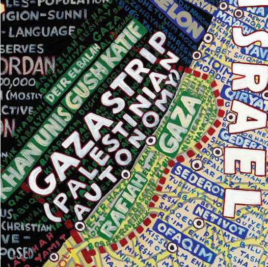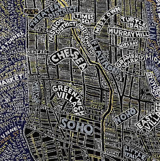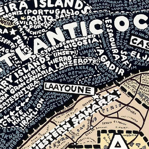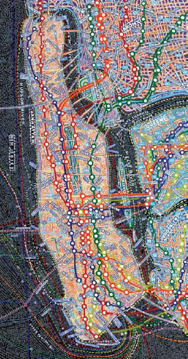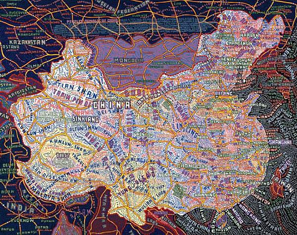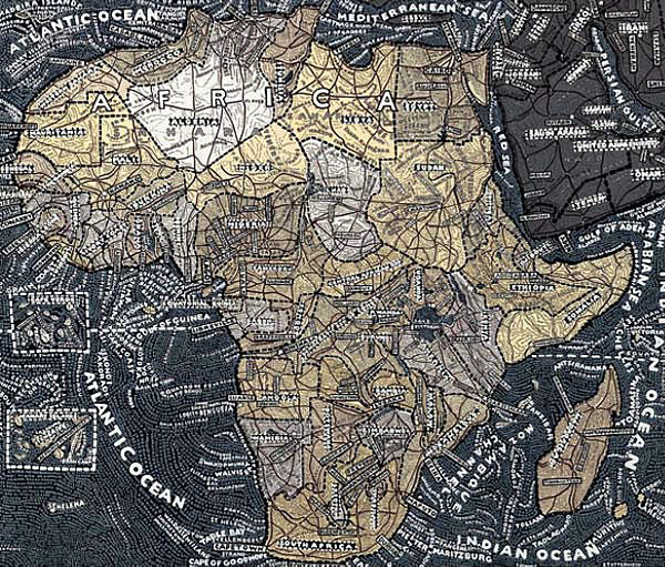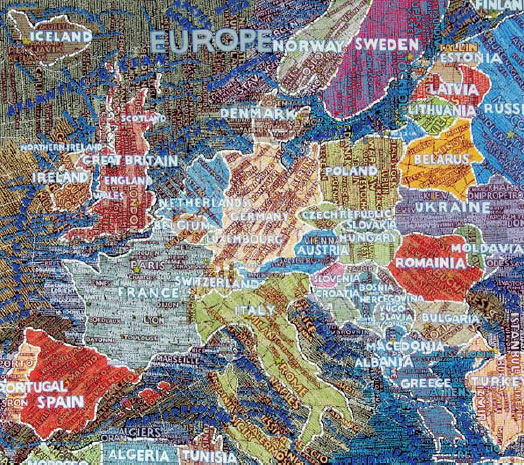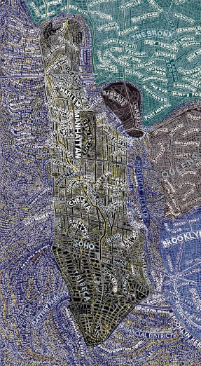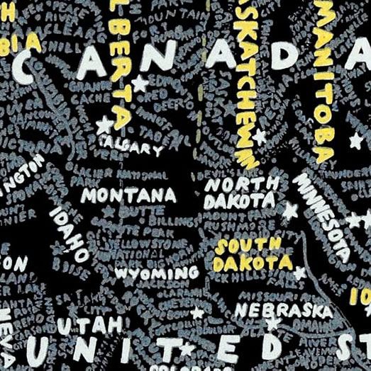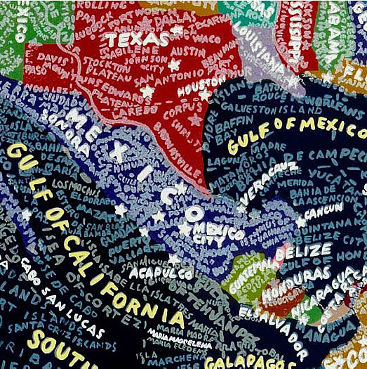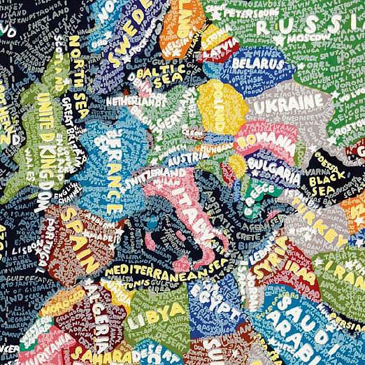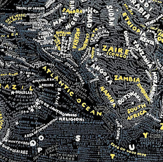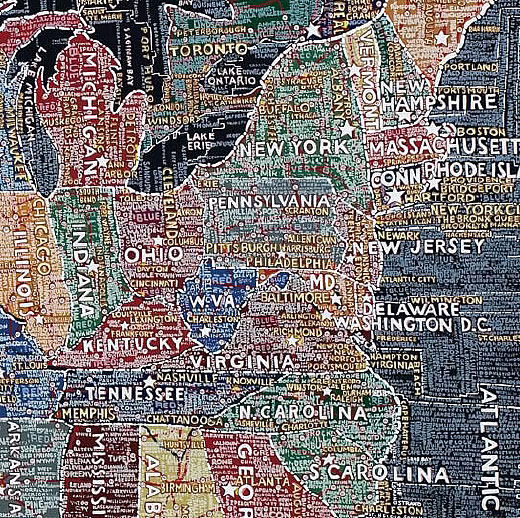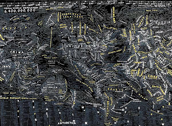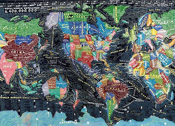 Aux murs de la Stendhal Gallery s'affichent d'incroyables planisphères reproduisant le monde, les Etats-Unis, l'Europe, l'Afrique ou même simplement les déplacement dans New York. Des cartes constituées par les informations elles-mêmes. Des mots, des noms, des infos, denses, reproduites à la main qui ensemble forment le dessins des lieux exposés.