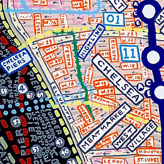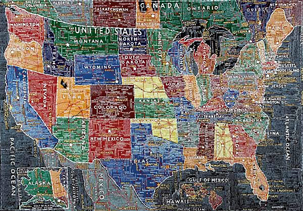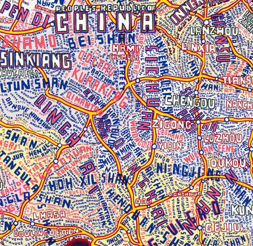 Commencées dans les années 1990, plutôt comme un jeu, sans trop y penser et sur de petits formats, les cartes de Paula Scher se sont incroyablement complexifiées et agrandies au fil du temps jusqu'aux très grands formats exposés ces jours-ci à la Stendhal Gallery.