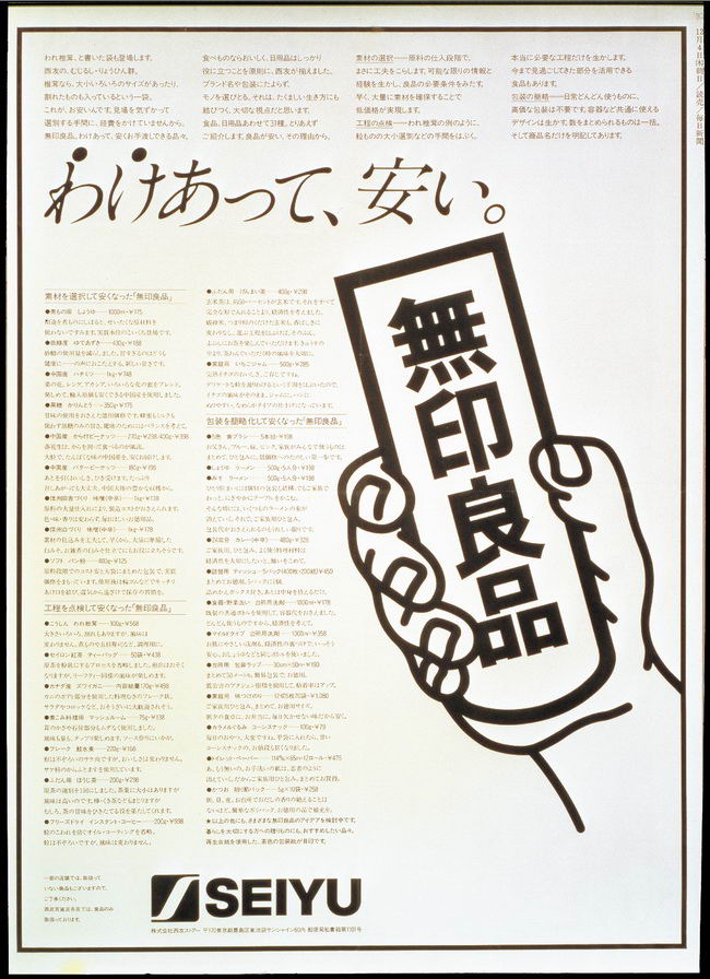 Ils ont ainsi donné un territoire d'expression original à la marque Muji. Les publicités des débuts sont didactiques, remplaçant les visuels des produits par du texte en expliquant les qualités, texte juste agrémenté par un dessin ludique autant que minimaliste. Avec une notoriété de marque croissante, la part du texte explicatif diminue au fil des ans, laissant plus de place à des illustrations souvent décalées par rapport aux produits, insistant plutôt sur le positionnement original de Muji. Et depuis 2003, sous l’impulsion de Kenya Hara, Muji se concentre sur les valeurs de la marque, utilisant en particulier cette idée de vide chère à la culture japonaise. Le message doit être un support vide laissant place aux visions du client. Avec des photos montrant par exemple une silhouette humaine sur l’immensité de l’ancien lac asséché d’Uyuni en Bolivie ou une maison de thé traditionnelle au Japon. Le succès de la campagne se mesure ainsi à sa capacité à générer de multiples images dans l’esprit des spectateurs.