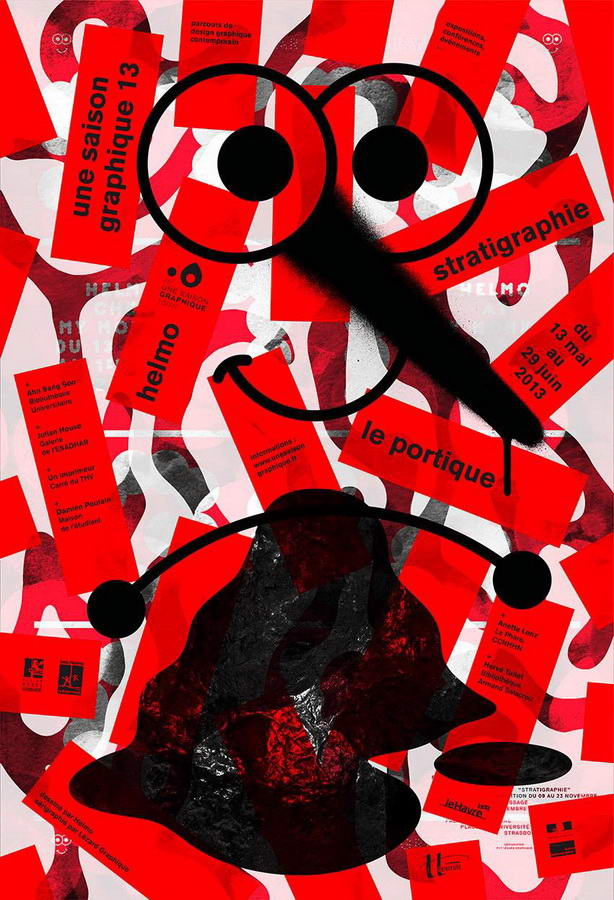 Une exposition qui prolonge celle, Stratigraphie, d’Helmo à la galerie My.Monkey à Nancy en 2012 (cf notre article- galerie dans cette même rubrique). On y retrouve avec plaisir la patte du duo Thomas Couderc et Clé¬ment Vauchez, ce désir d’impliquer le spectateur en accumulant les couches visuelles, en lui donnant plusieurs niveaux de lecture, en faisant se répondre les affiches.