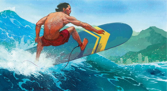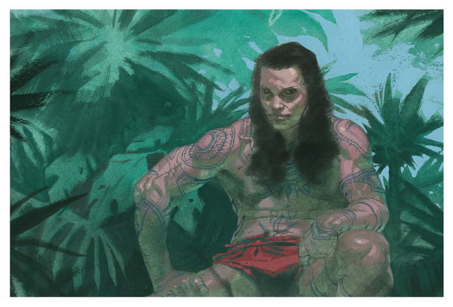 Diplômé de l’Institut des Arts appliqués de Zagreb, devenue entretemps capitale de la Croatie, Esad Ribić s’est ensuite ennuyé à à l’Académie des Beaux-Arts de Zagreb, préférant la peinture classique à l’abstraction alors en vogue. Il démarre ensuite sa carrière en animation puis, après la guerre civile, se tourne vers les comics et se fait remarquer par DC Comics et Marvel. Sa technique prodigieuse éclate dans Thor, les aventures du dieu nordique narrées par Jason Aaron. La minisérie Les Guerres secrètes, parue en 2015 et écrite par Jonathan Hickman, un des principaux créateurs de l’univers Marvel, assoit définitivement la notoriété de l’artiste. Comme Frank Frazetta (1928–2010), l’illustrateur américain qu’il a admiré avec ferveur dans sa jeunesse, Esad Ribić applique la couleur en direct sur le papier, mêlant aquarelle et gouache. Autrement dit, il peint. C’est sa marque de fabrique qu’il applique ici à l’univers hawaïen.