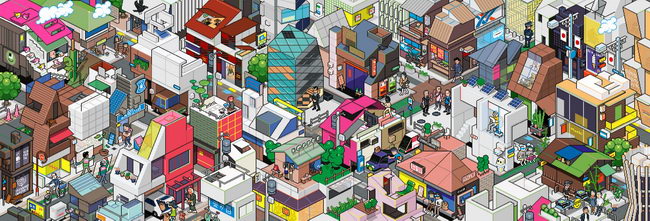 Les créations de eBoy ont un semblant de déjà-vu. Sans doute à cause des très nombreuses influences qu’elles recèlent : de la publicité aux jeux d’arcade, des rayons des supermarchés aux Lego sans oublier les maquettes des magazines. Leurs oeuvres pixélisées sont aussi simples que complexes, forcément abstraites et pourtant si proches d’un réel qu’on s’étonne parfois de reconnaître jusqu’aux visages de celles et ceux qui les peuplent, comme ici dans ce Travel Book dédié à Tokyo.