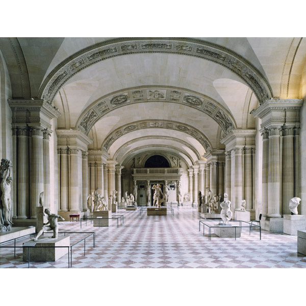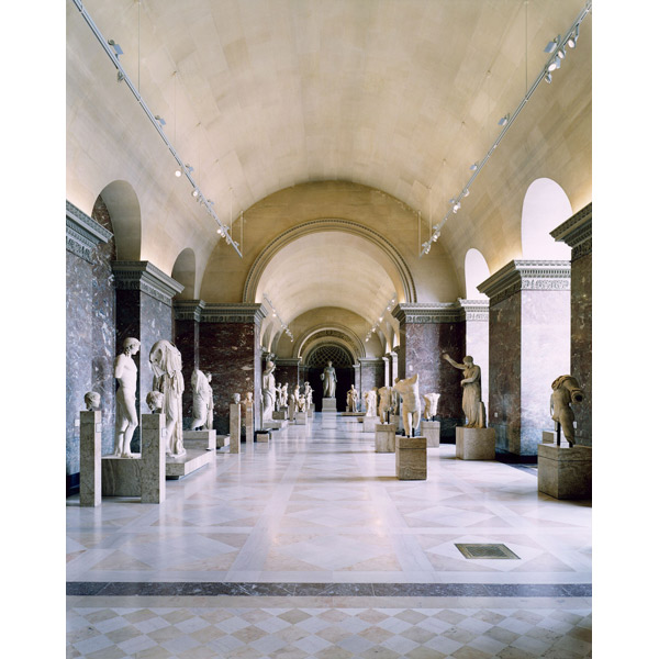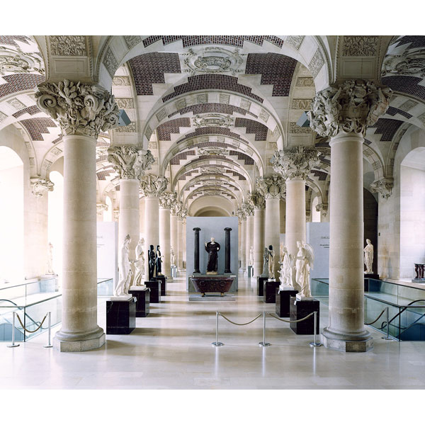 Le monumental, la perspective de Piero Della Francesca, et la lumière naturelle s’allient pour accoucher de compositions photographiques perpétuant l’enseignement de l’école de Düsseldorf, berceau d’une nouvelle approche de la photographie, dévouée au dogme de la lumière naturelle, à l’objectivité maximale, ainsi qu’à une mise en scène laissée au soin de l’instantané. Fondée par le couple réunissant Bernd et Hilla Becher, cette école, née en 1976, fut médiatisée grâce aux séries en noir et blanc de bâtiments industriels, d’usines, et d’ateliers aux allures d’apocalypse lunaire. Les tirages de Candida Höfer s’introduisent, eux, au sein de lieux dédiés à la connaissance : bibliothèques, églises, opéras. A la manière de Thomas Ruff, lorsqu’il s’immisce dans les salles à manger populaires, la photographe se fait témoin, confidente d’une ambiance où elle s’est invitée. Candida Höfer va bien au-delà de ce qui pourrait s’apparenter à un visuel tout droit issu du guide du Musée du Louvre. Certes, on remarque qu’elle a pris soin d’attendre l’évacuation du public, mais elle choisit aussi de tout livrer de l’espace d’exposition, ne cherchant pas à dissimuler les dispositifs d’éclairage ou d’alarme, comme l’aurait certainement fait le maquettiste du fameux guide. Vidé de ses habitants passagers, le musée se retrouve face à lui-même, à son histoire, semblant s’interroger sur son propre corps : l’architecture. Cette dernière devient alors le sujet des compositions, jouant des effets de miroirs générés par la symétrie quasi parfaite des cadrages de l’artiste allemande. Lieu de culture, d’érudition et d’abandon à l’art, le Musée du Louvre dévoile ici ses entrailles sous la forme impressionnante d’un tube, aspirant celui qui ose y plonger le regard. La solitude envahit le regardant, le respect avec, laissant s’imprimer en lui le sentiment de pénétrer dans un temple. Les colonnes antiques viennent embrasser les voûtes, les sculptures s’alignent créant une haie d’honneur. Rien ne vient perturber la mise en scène de ce théâtre instantané. Hymne aux espaces d’exposition ou angoisse d’une culture qu’on pourrait délaisser ?